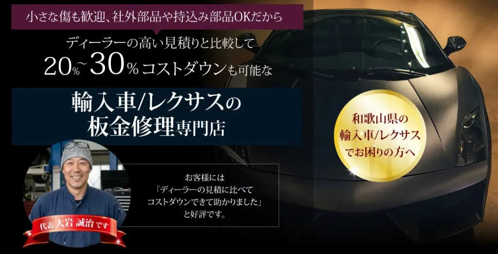 その思いで和歌山で板金修理いたします。ディーラーの高い見積書をご持参頂ければ、お得なご提案ができます。初めて中古輸入車を購入してぶつけてしまった女性も安心してご来店できるお店です。また保険で事故修理をする場合にはディーラーより高品質で仕上がります。輸入車は関西の業者様からも依頼されてボディーをキレイに仕上げるスキルがあります。BMW・MINI・レクサスも実績多数です。